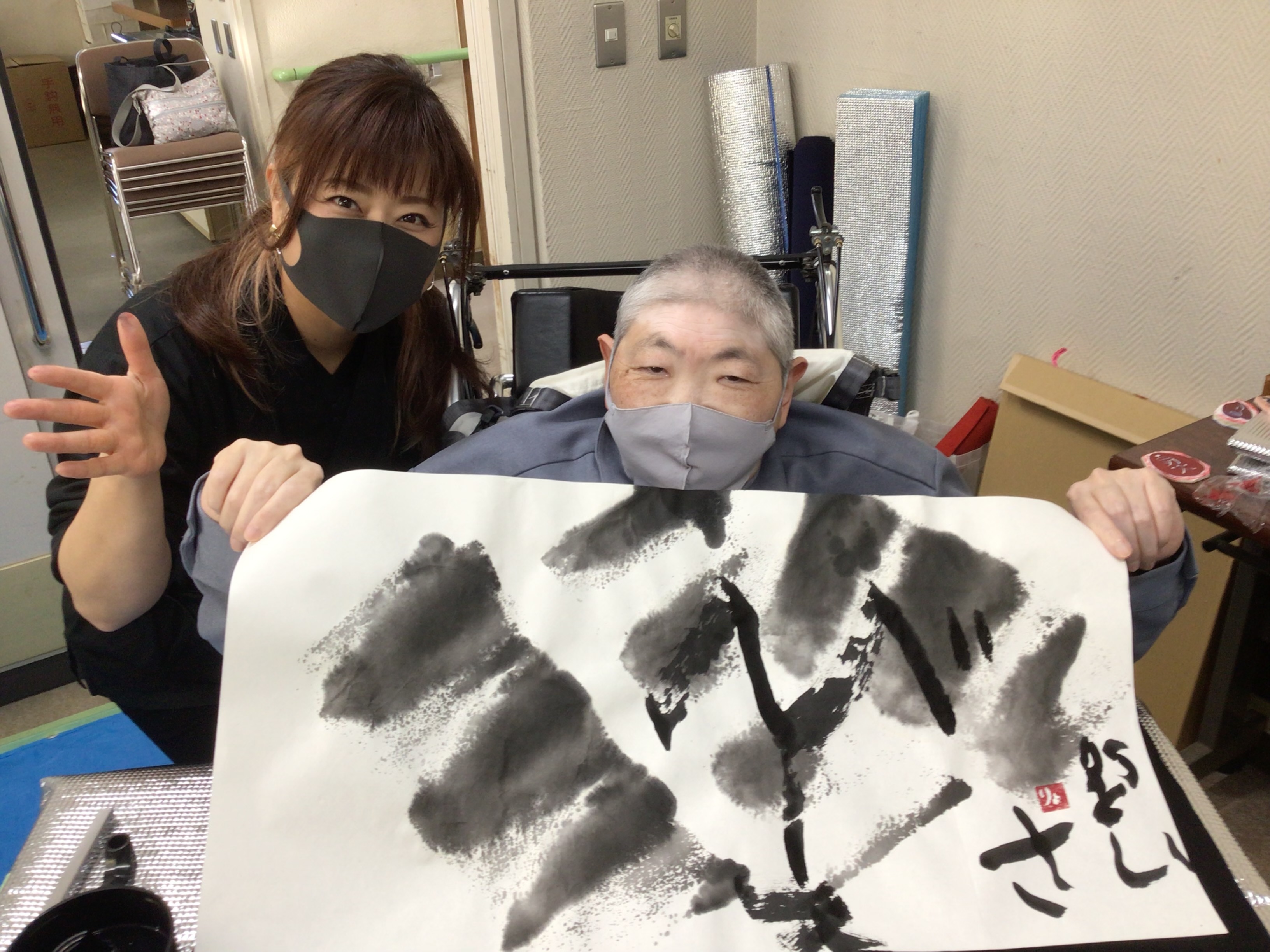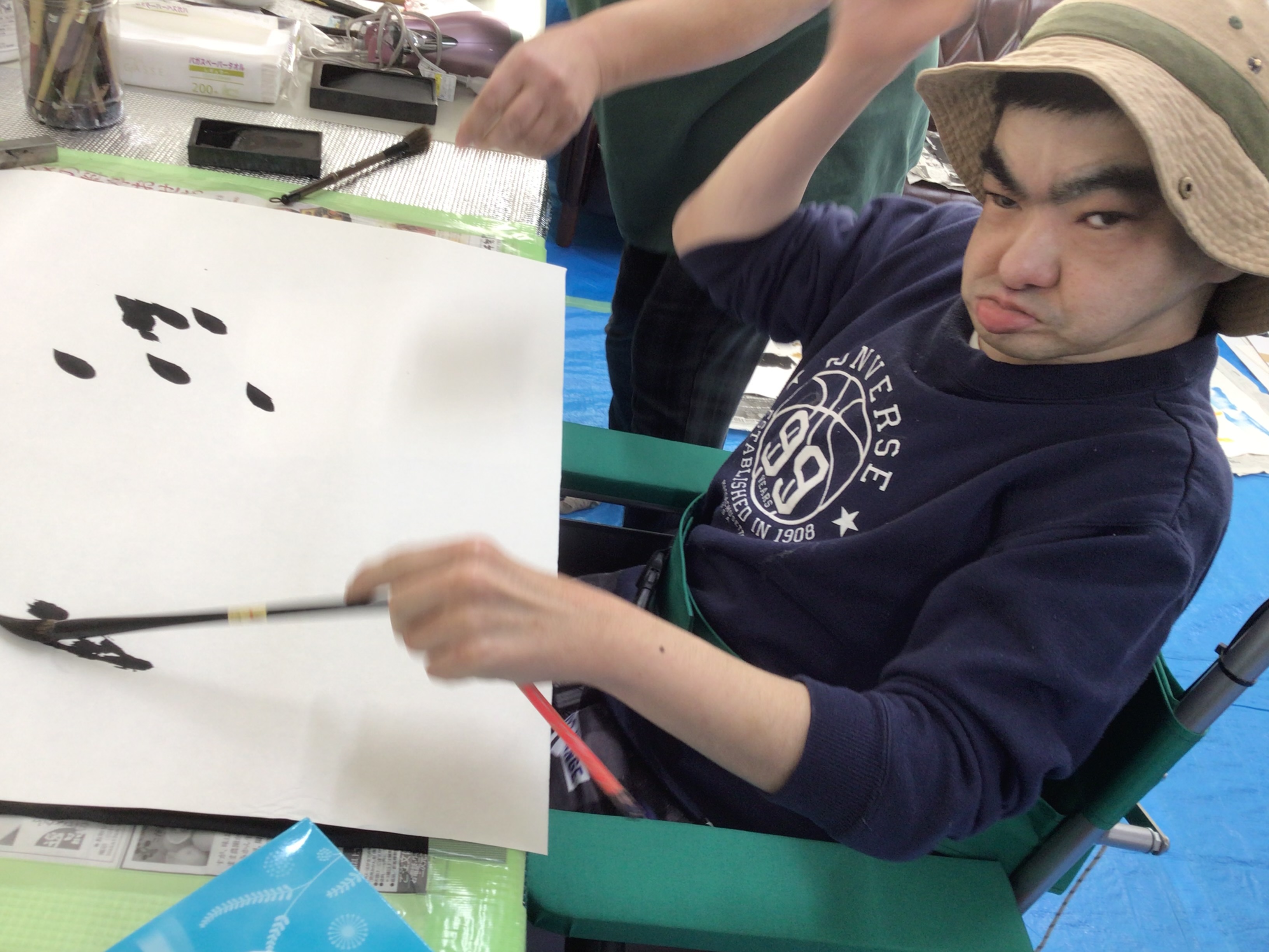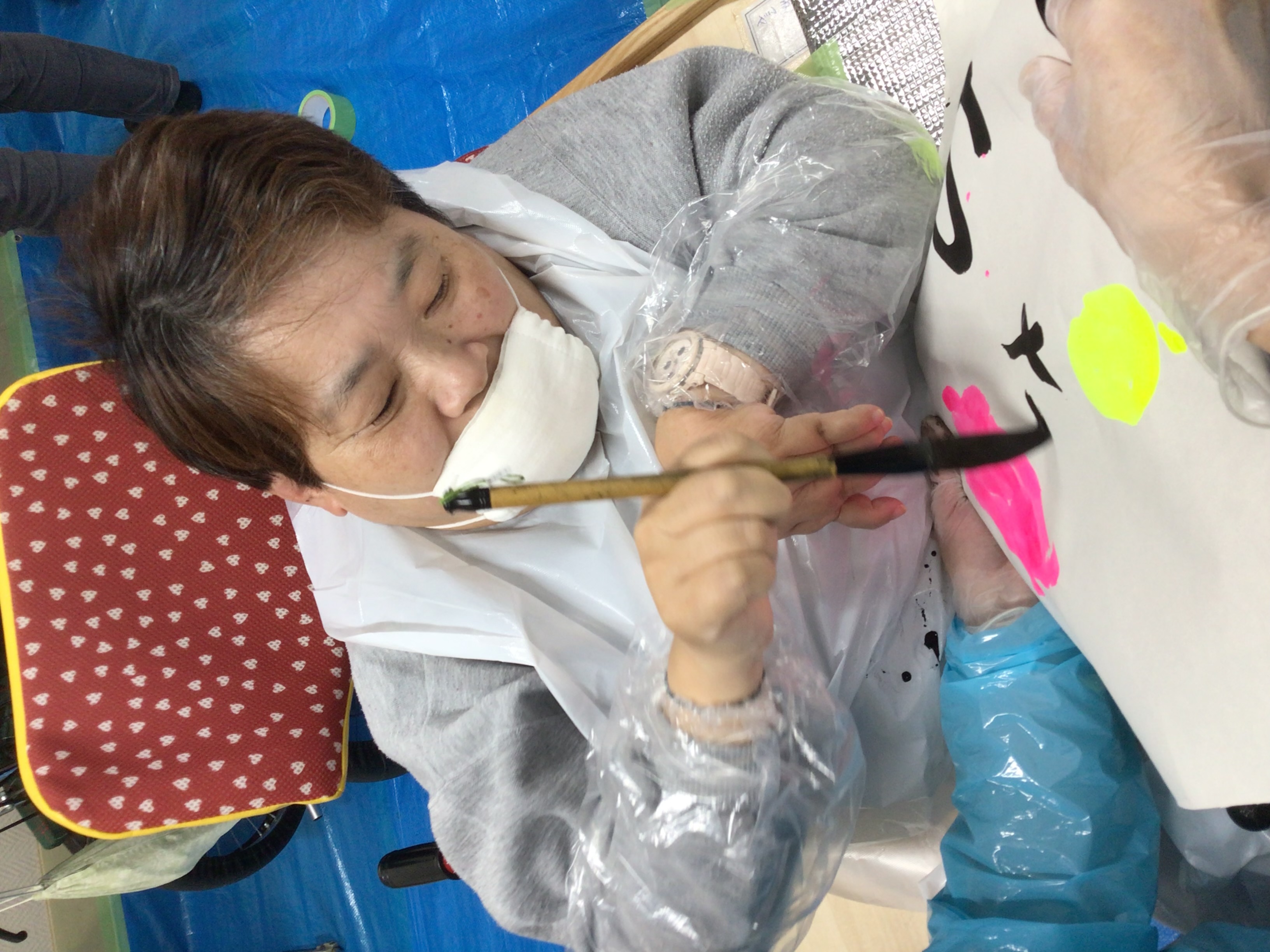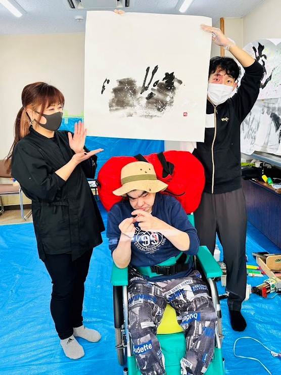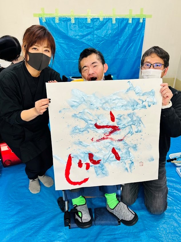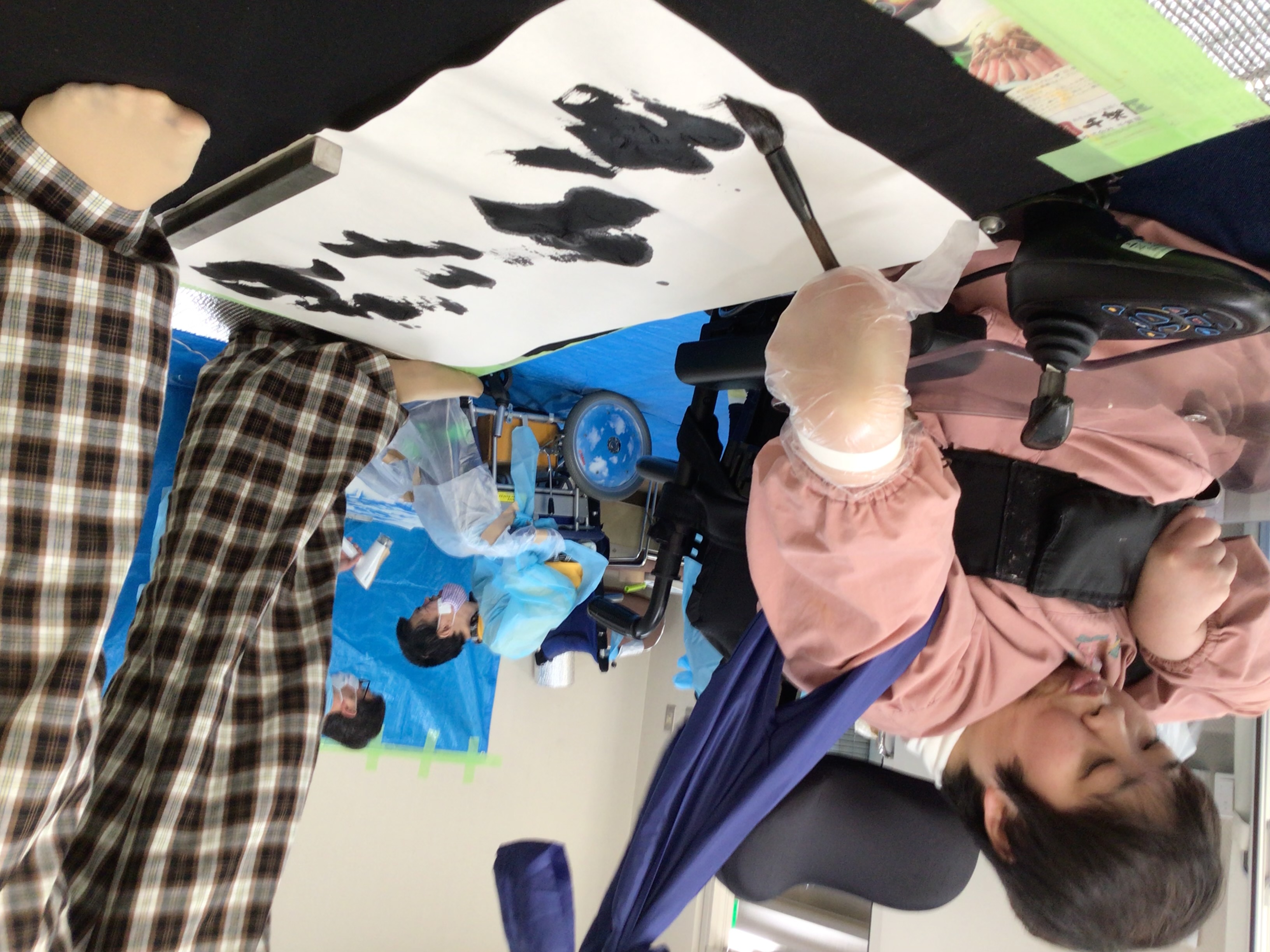 職員に身体を支えてもらい、ダイナミックな文字を書いた人もいます!