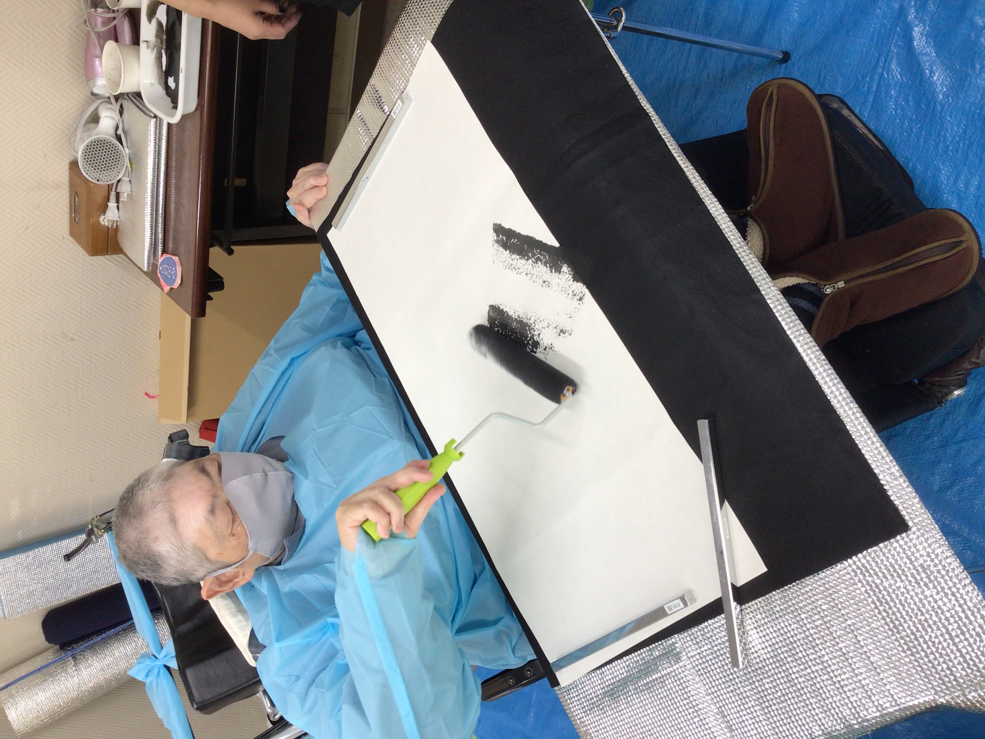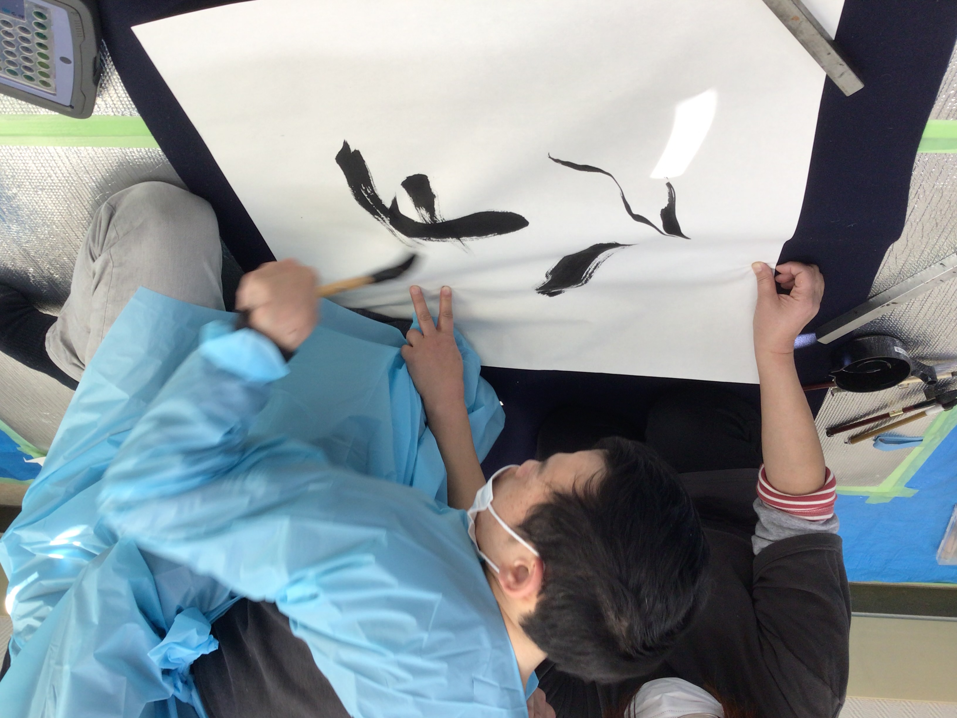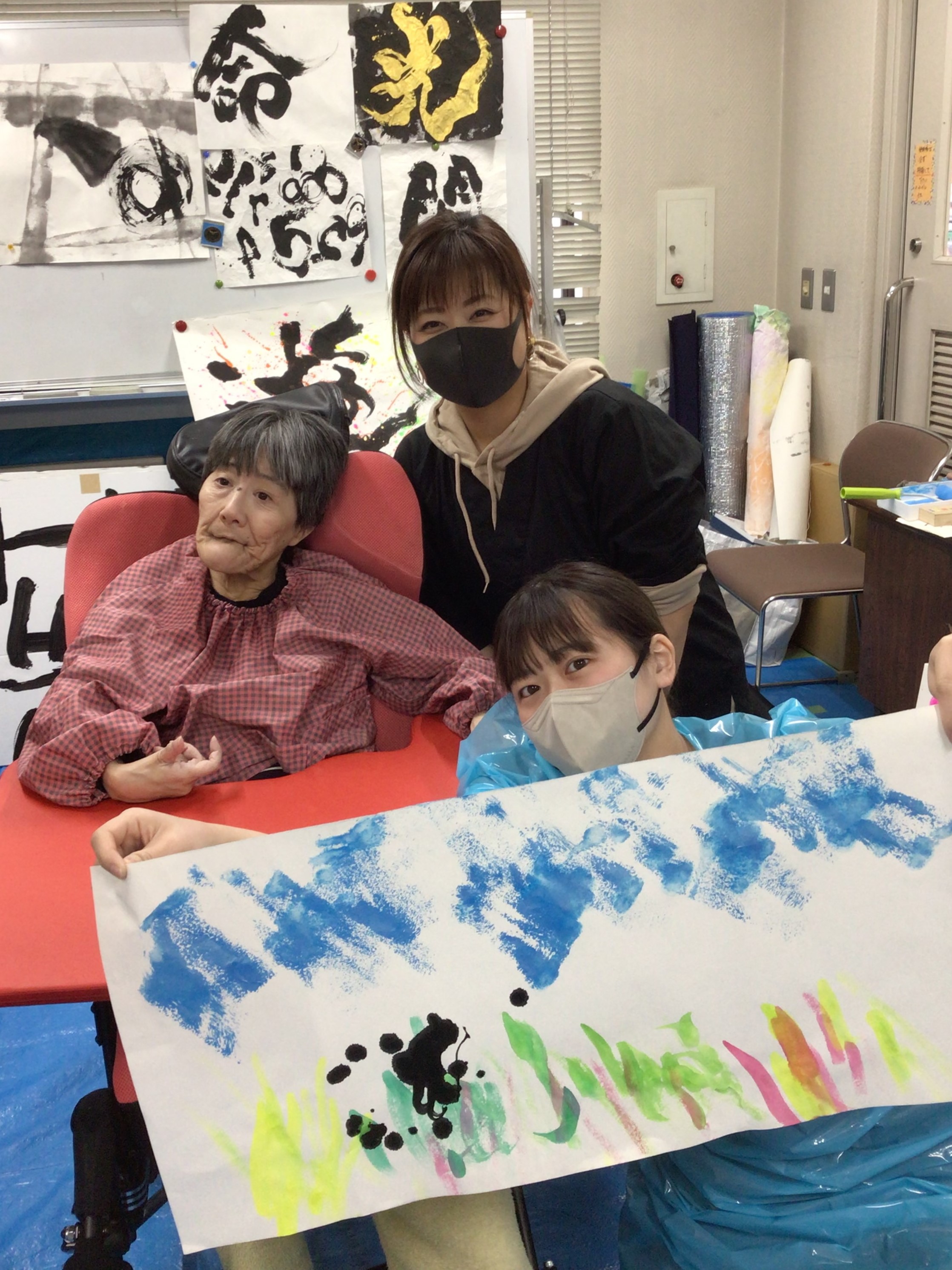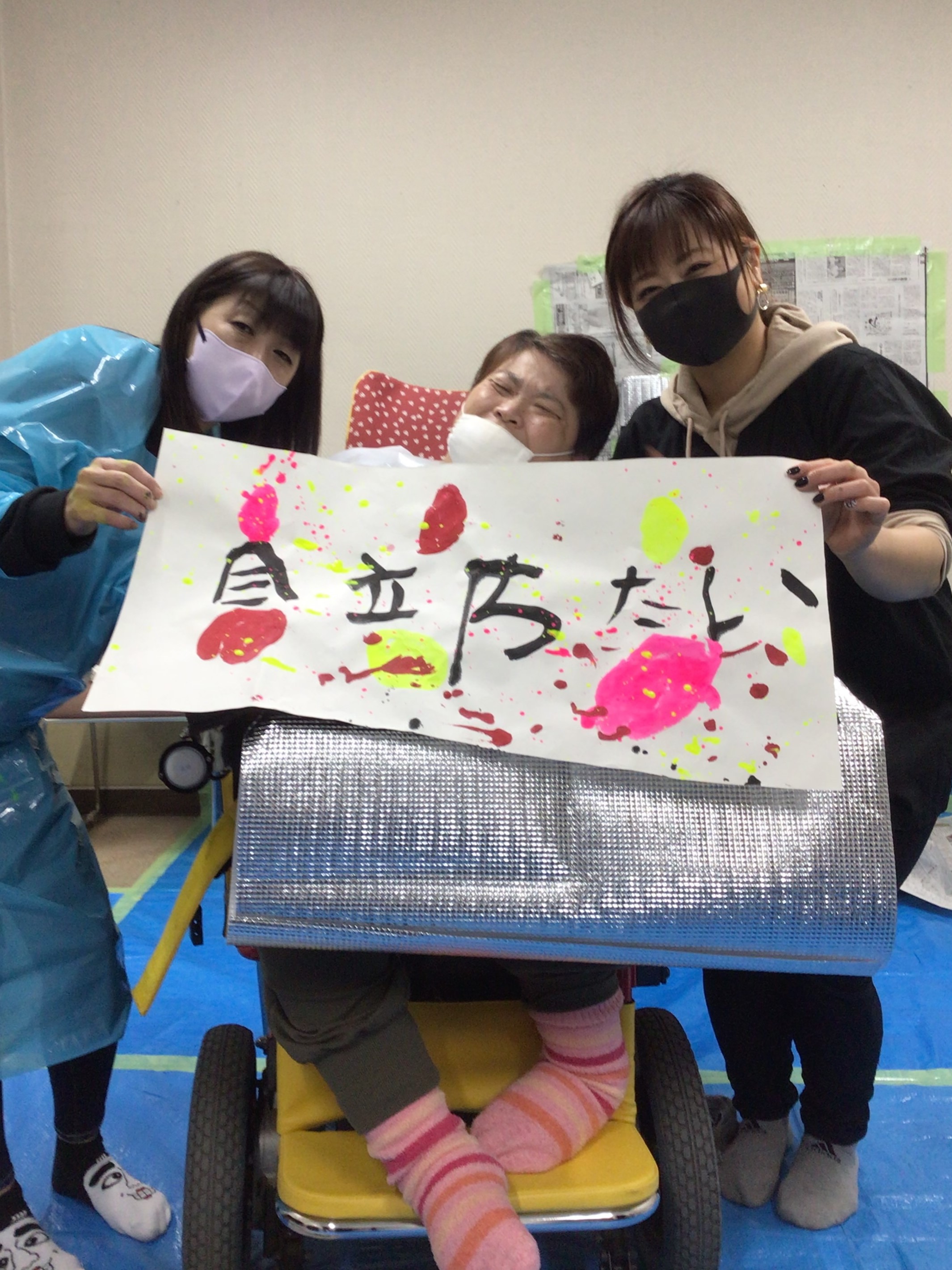 職員に身体を支えてもらい、ダイナミックな文字を書いた人もいます!