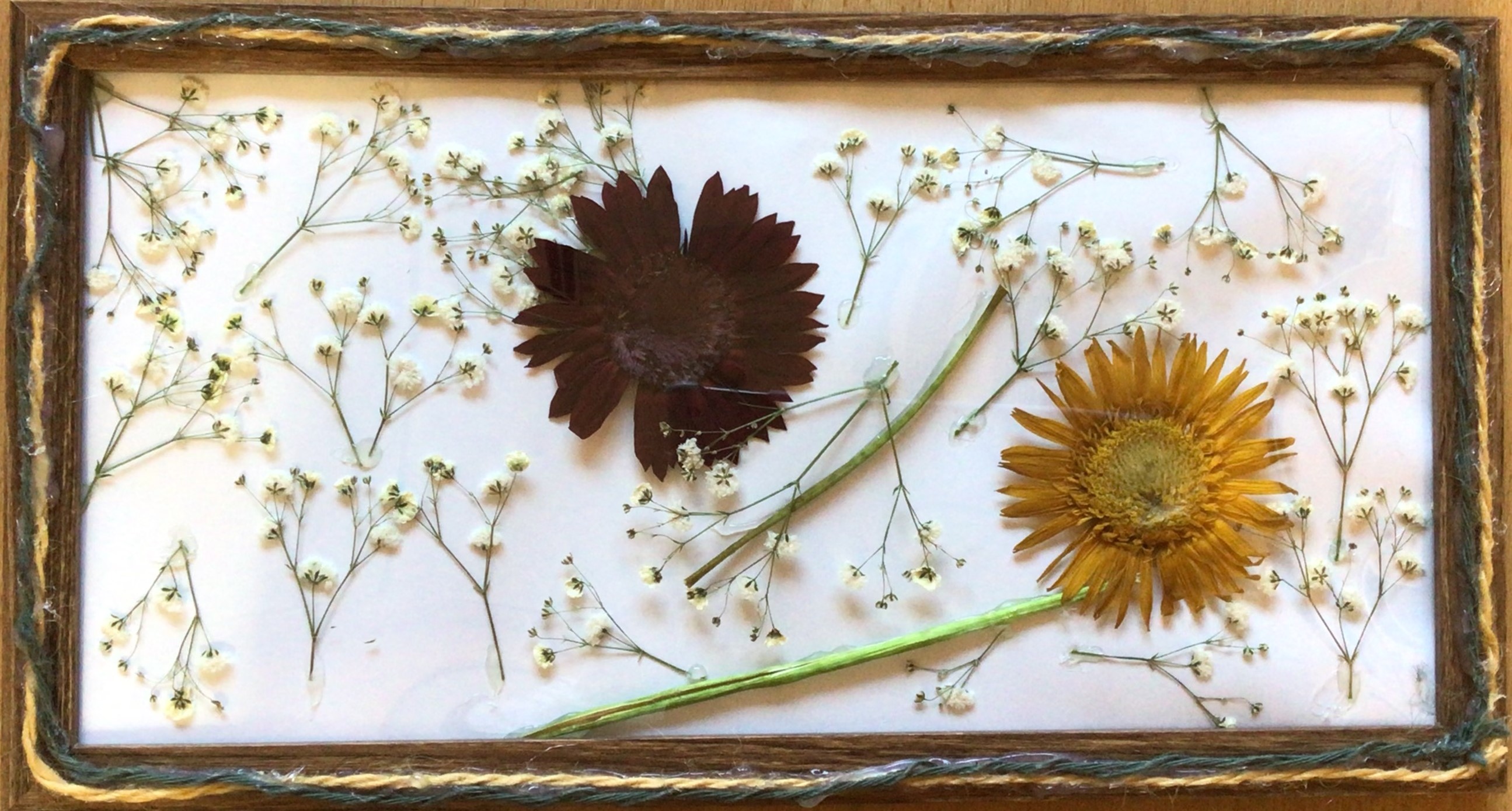 おおきなひまわり「カスミソウをゴロゴロ押しつぶして、水分を抜いたところ。」「お花に茎を付けたところ。」