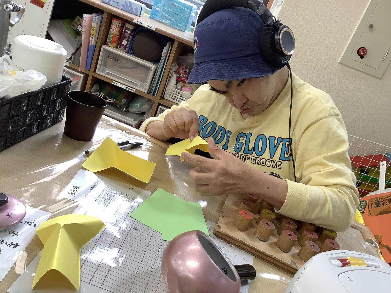 画用紙を手渡すと折ってくれる“ぺっちゃんオリジナル折り”。