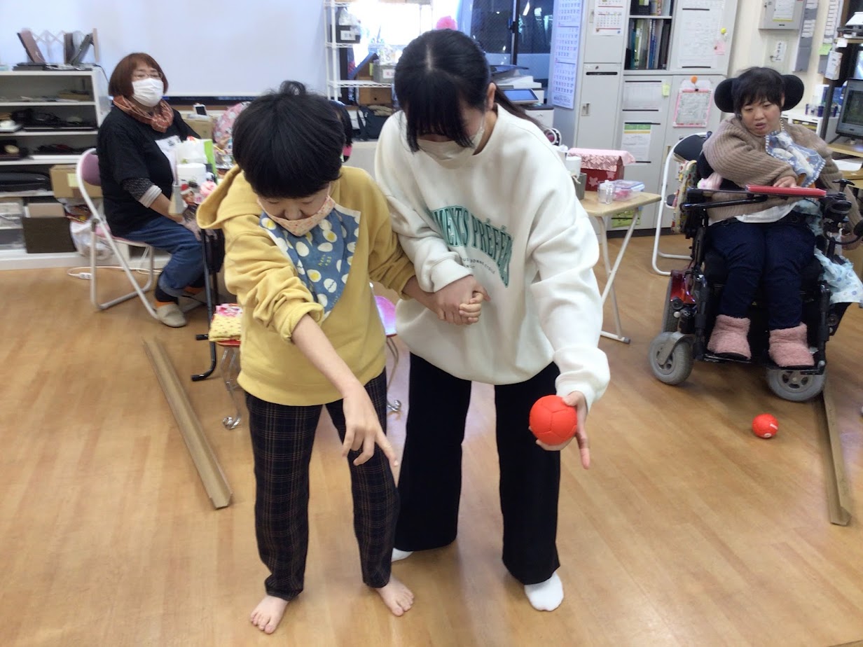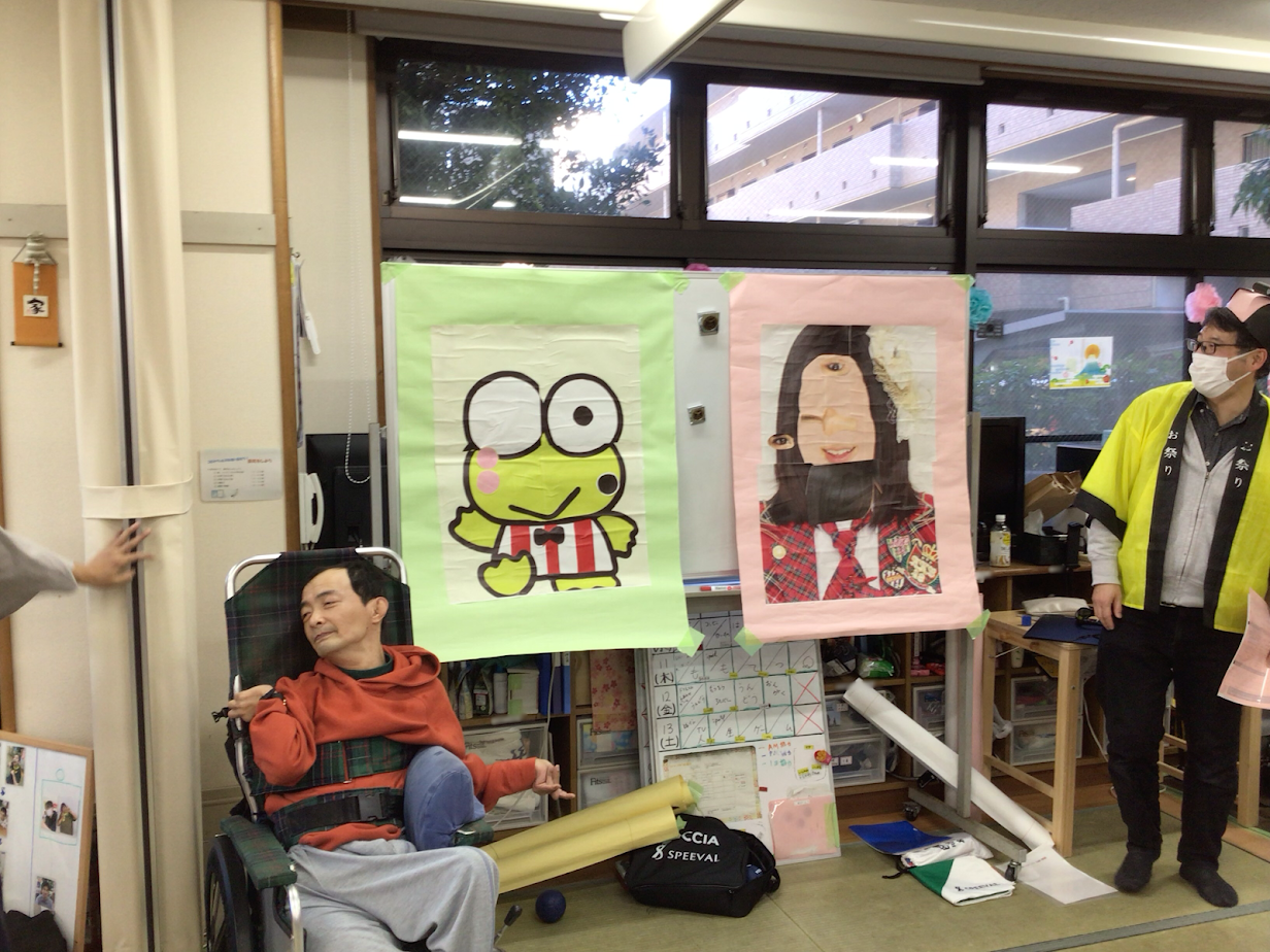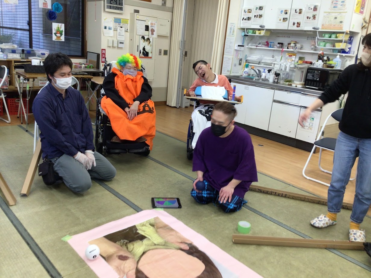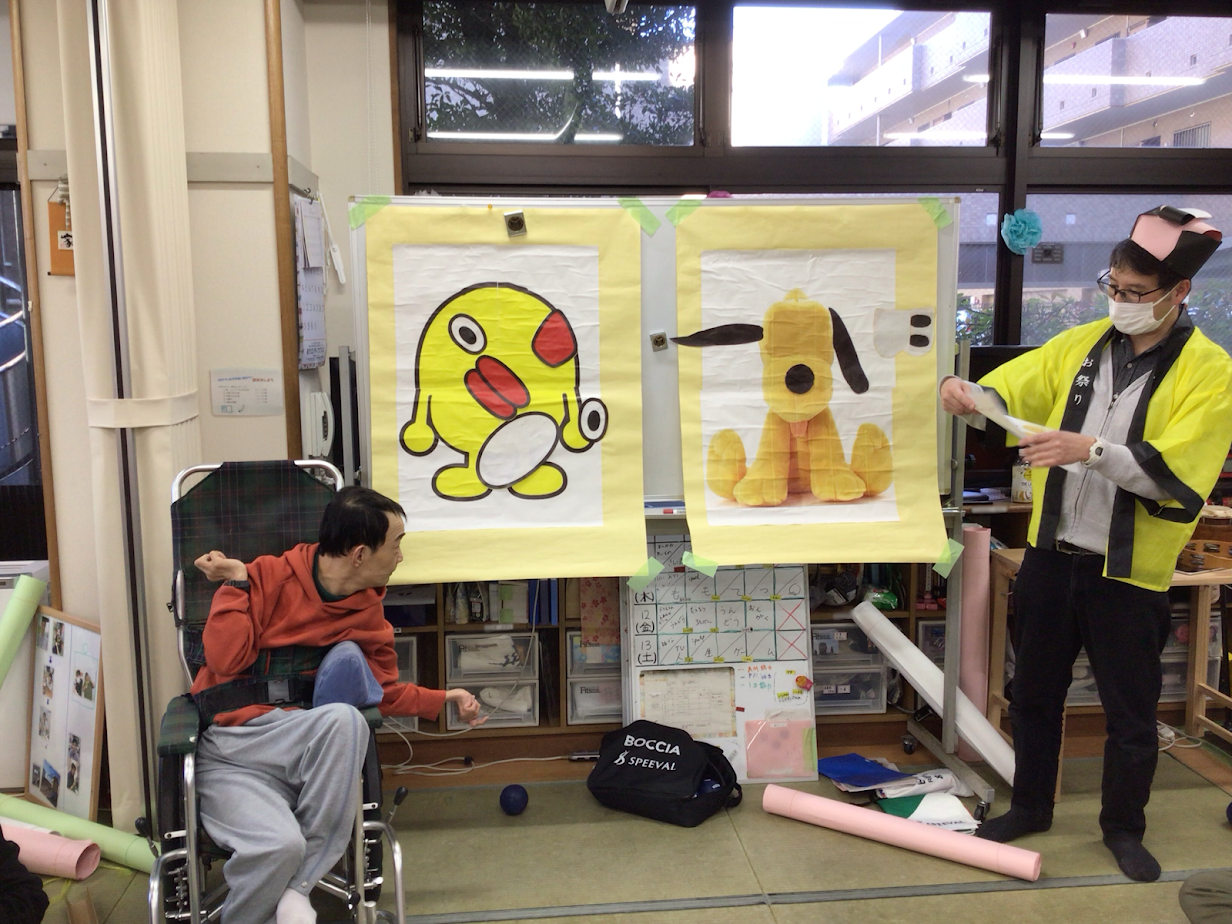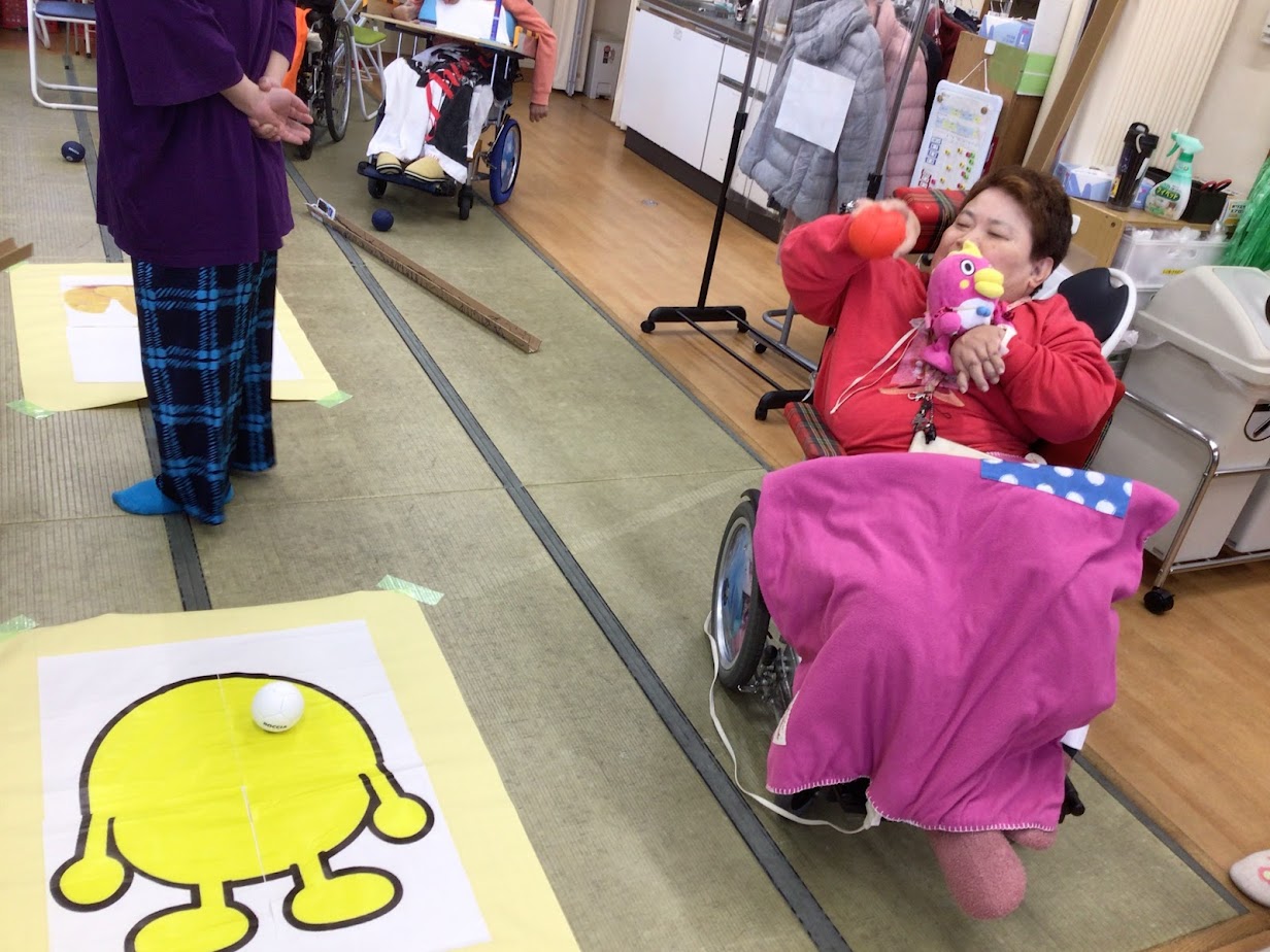 福笑いのルールは一般的なものと同じで様々なパーツを並べて顔を完成させるというものですが、今回はメンバーさんがハマっている「ボッチャ」と合体して、「ボッチャ福笑い」にしてみました。